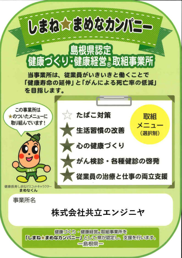 「しまね☆まめなカンパニー」とは、島根県が推進する従業員の健康づくりに積極的に取り組む事業所を認定する制度です。