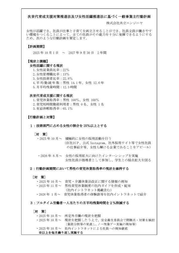 共立エンジニヤでは、「次世代育成支援対策推進法」および「女性活躍推進法」に基づき、